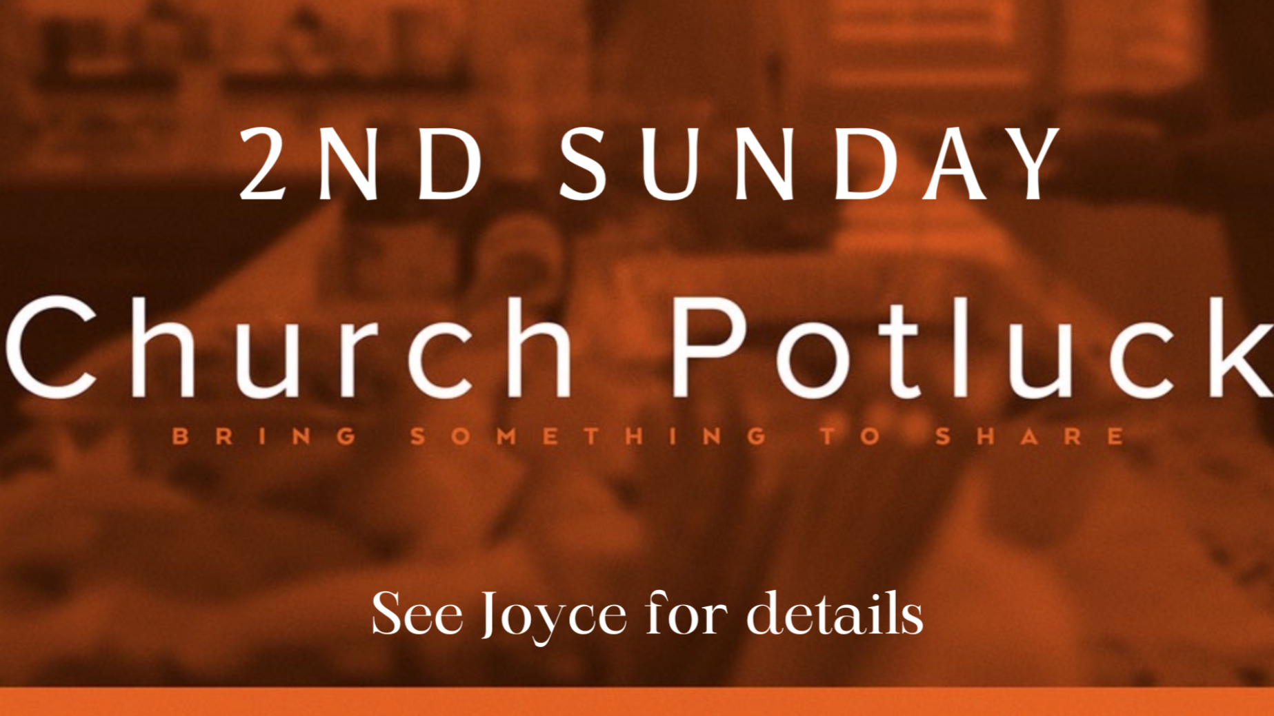 As a church body, we place a high value on community and fellowship. We love connecting with people and getting to know them on a deeper level. One of the ways we do this is through food! So with that heart, we would like to invite you to join us every second Sunday of the month following the morning service for our regular potluck lunch.